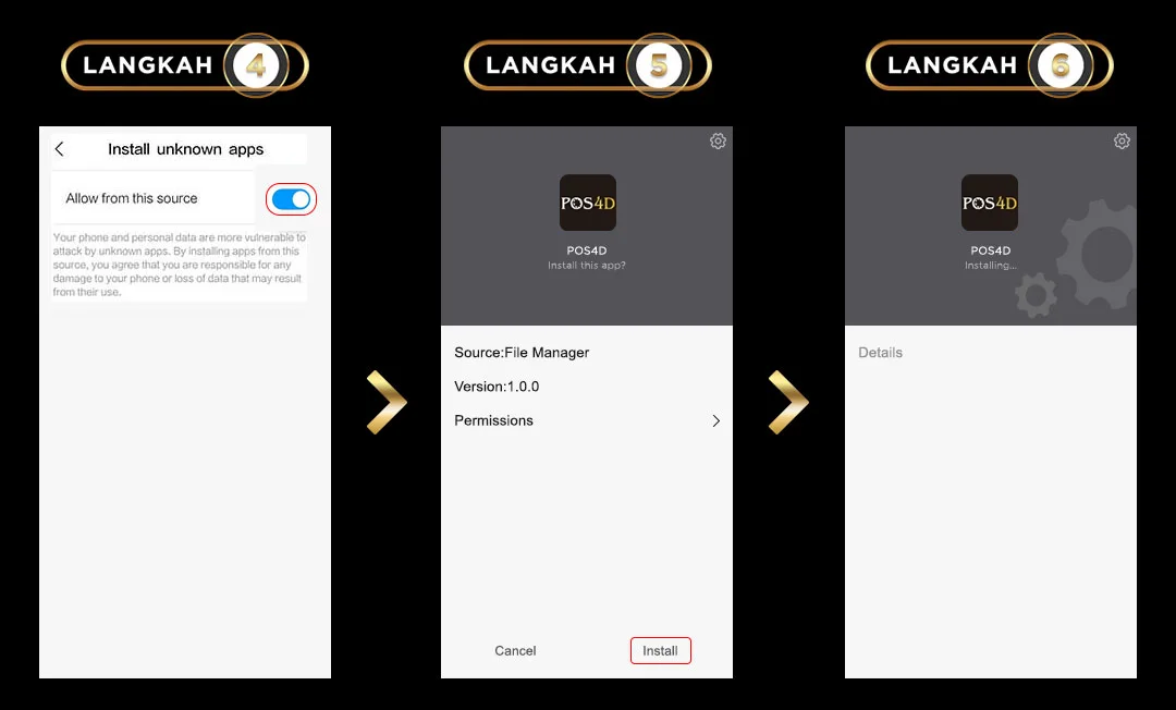 2. JIKA TIDAK DAPAT MELAKUKAN INSTALASI, MASUK KE SETTING > SECURITY DAN AKTIFKAN UNKNOWN SOURCES LALU KLIK INSTALL UNTUK MEMULAI PROSES INSTALASI.